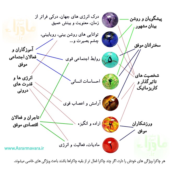 همانطور که گفتم وقتی شما چند چاکرا را فعالتر کنید ویژگی های خاصی پیدا میکنید، به عنوان مثال افراد کاریزماتیک و افرادی که نفوذ زیادی روی مردم دارند چاکراهای ۲ ، ۳ ، ۵ ، ۶ و ۷ آنها فعال تر از بقیه چاکراهای آنهاست.